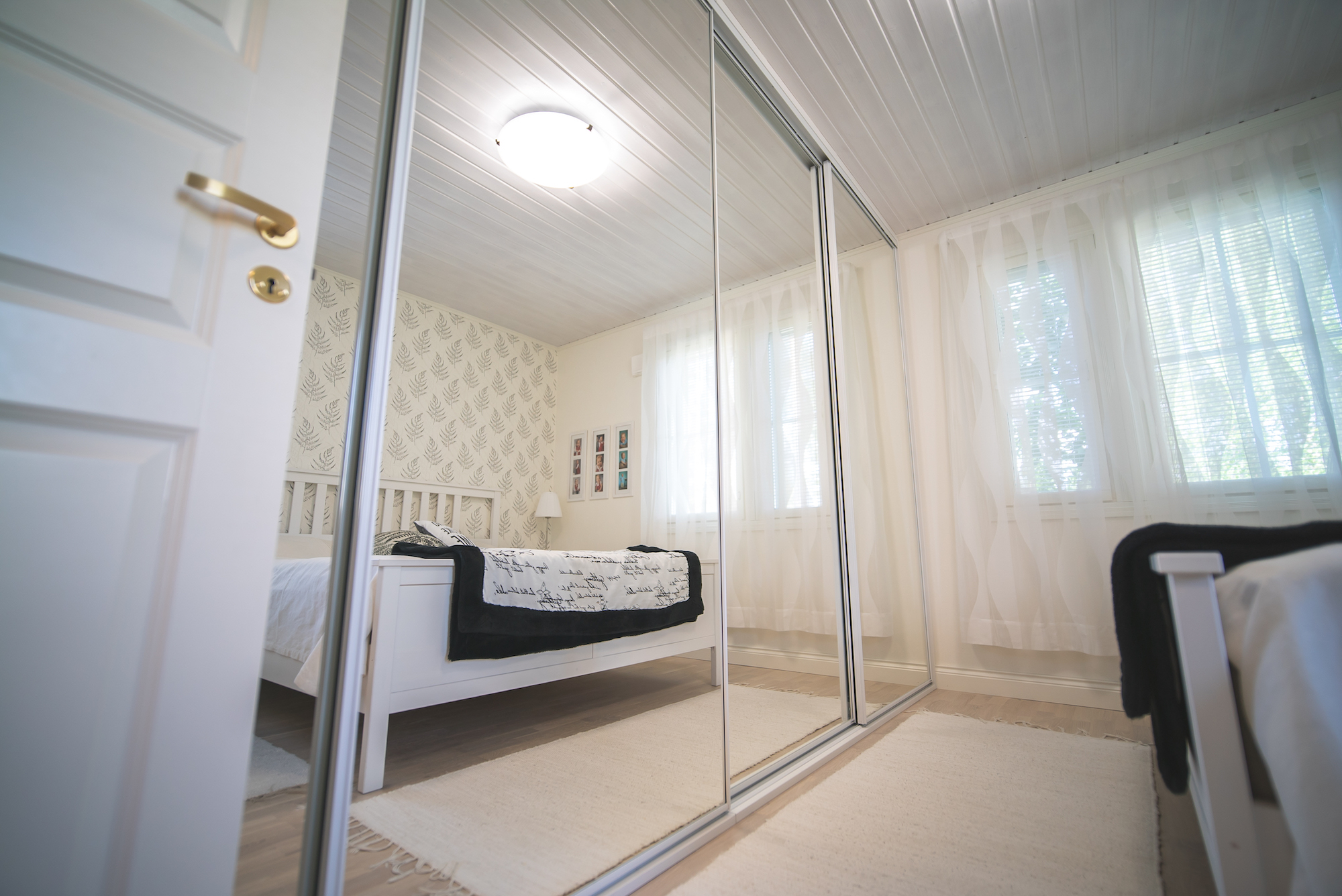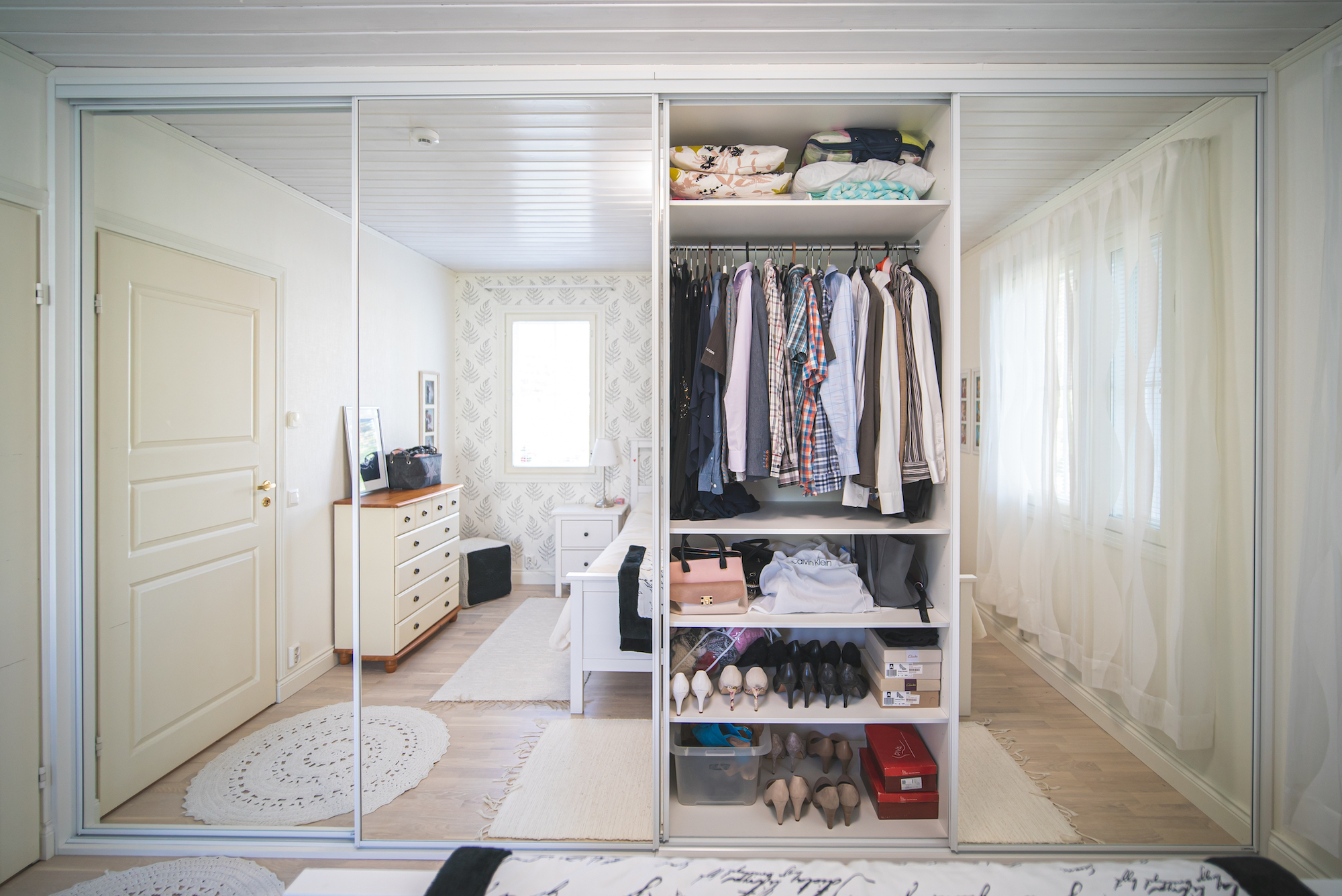 – Meille yksi tärkeä elementti liukuovikomerossa on se, että se on säilytystilan lisäksi myös sisustuselementti. Se tuo tilaan omaa särmää ja valoisuutta, jota olemme kaivanneet, Rinna iloitsee.