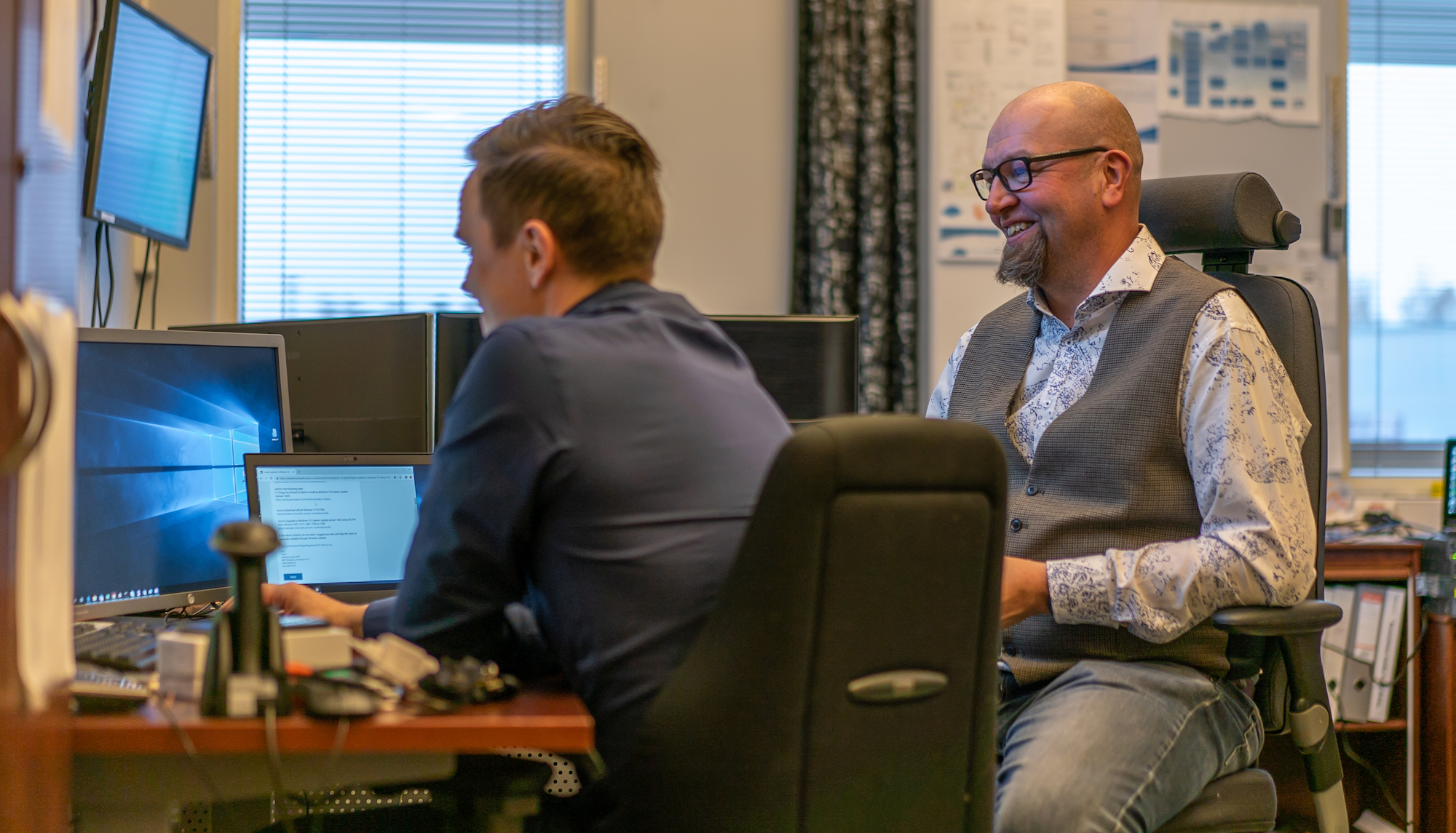 – Yhteistyö pitää sisällään meidän tapauksessamme kaiken, mitä IT:seen nyt voi kuulua. Jaamme töitä keskenämme. Joskus se voi olla Service Desk -hommaa, joskus siivotaan lattioita, joskus vedetään johtoa ja joskus johdetaan – eli kaikkea mahdollista, mitä tässä IT:ssä nyt voi olla. Olemme tällaisia sekatyömiehiä, Haapamäki virnistää.