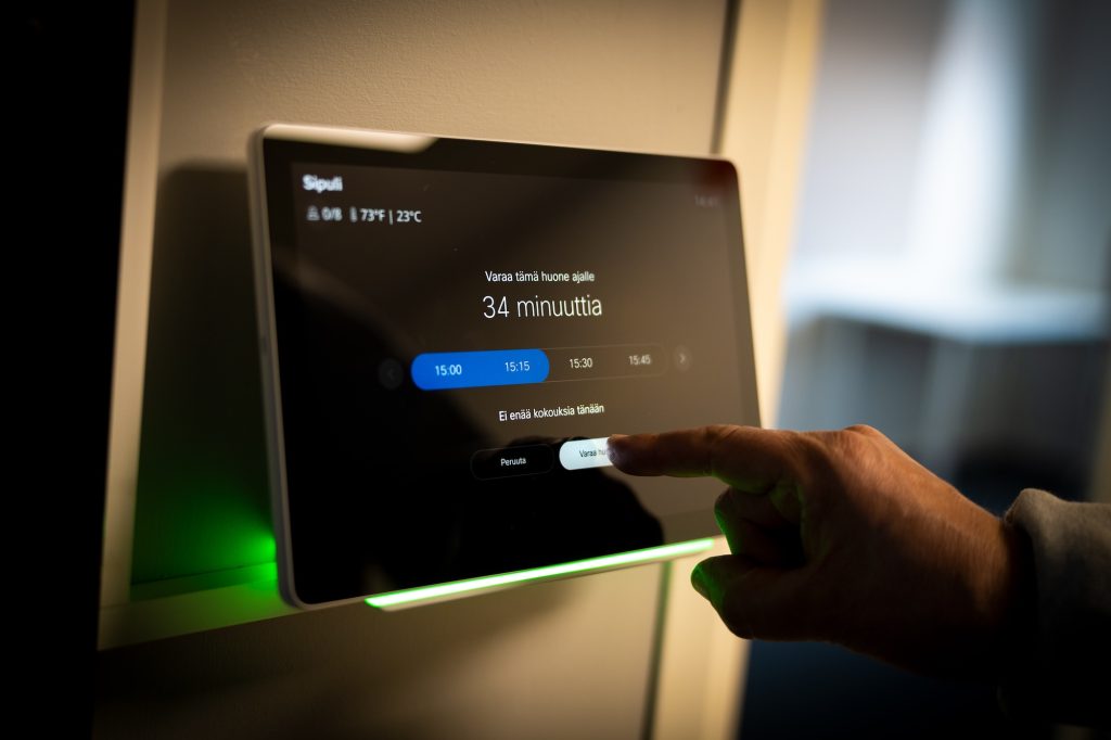 Neuvottelutiloissa on käytössä Cisco Room Kit -laitteet ja isot LG-näytöt, joista seurataan kokousta ja oman tietokoneen ruutua. Järjestelmää ohjataan tabletilta ja ovien pieliin asennettiin myös näytöt kertomaan tilan varausasteesta.