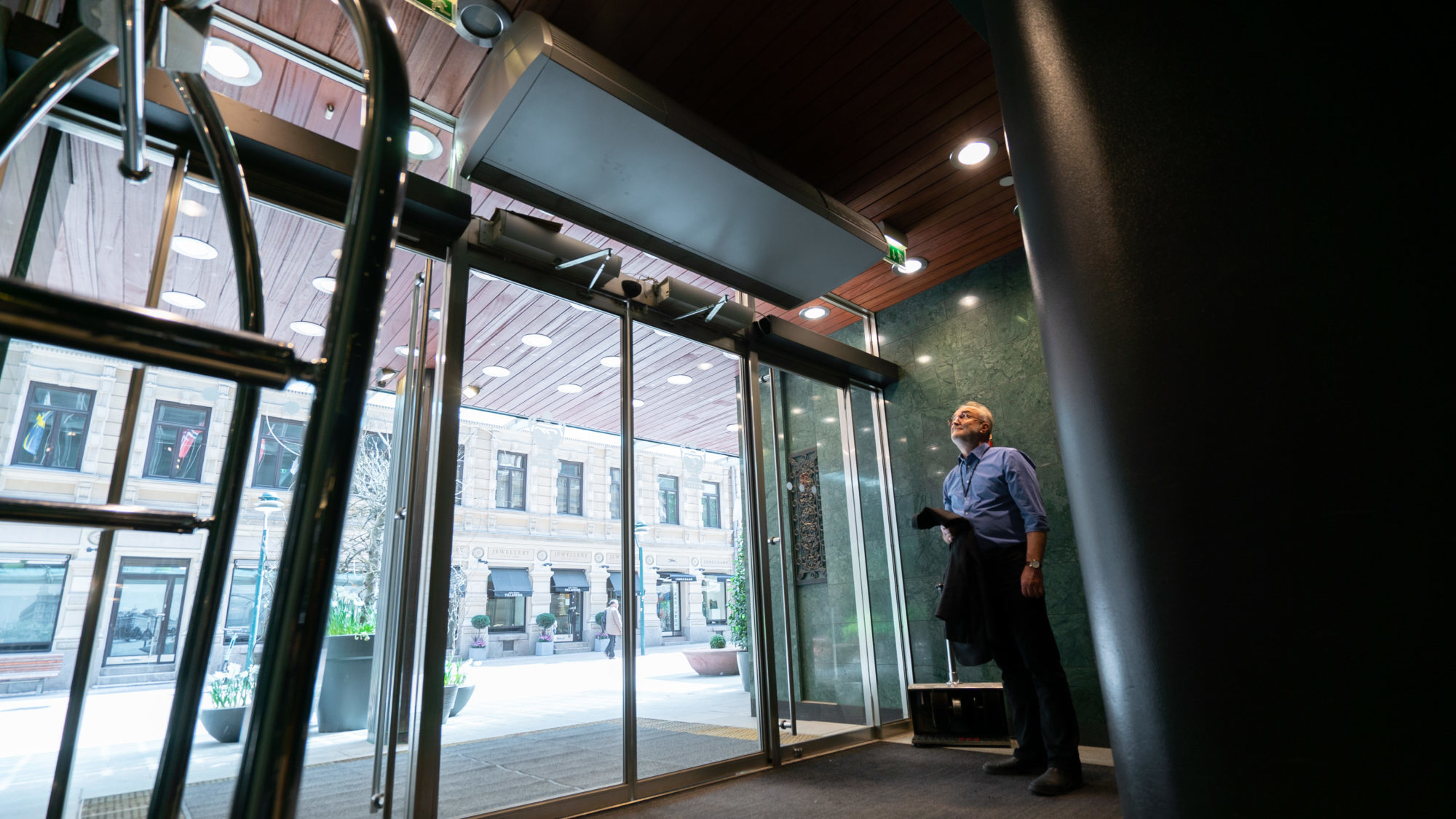 – Hotel Kämp on mahdollisimman vaativa kohde oviverhokoneille. Toinen niistä on asennettu suoraan ravintolatilaan, jossa on lasiseinät eikä ollenkaan tuulikaappia. Ravintolatilassa oviverhokoneen täytyy olla mahdollisimman äänetön, koska siellä pitää pystyä keskustelemaan ja nauttimaan olostaan ilman oviverhokoneen hurinaa. Nyt laite on ollut paikallaan viitisen vuotta eikä negatiivista palautetta ole tullut loppukäyttäjän suunnalta, Ainamo kertoo.