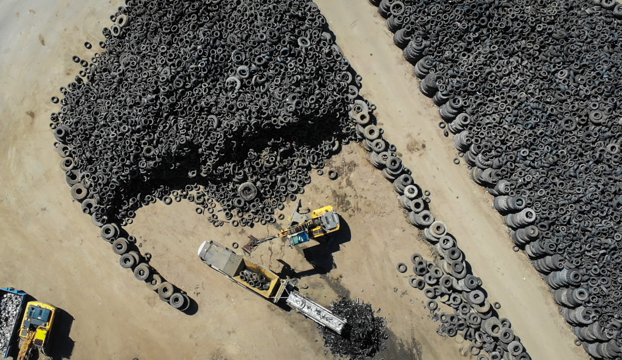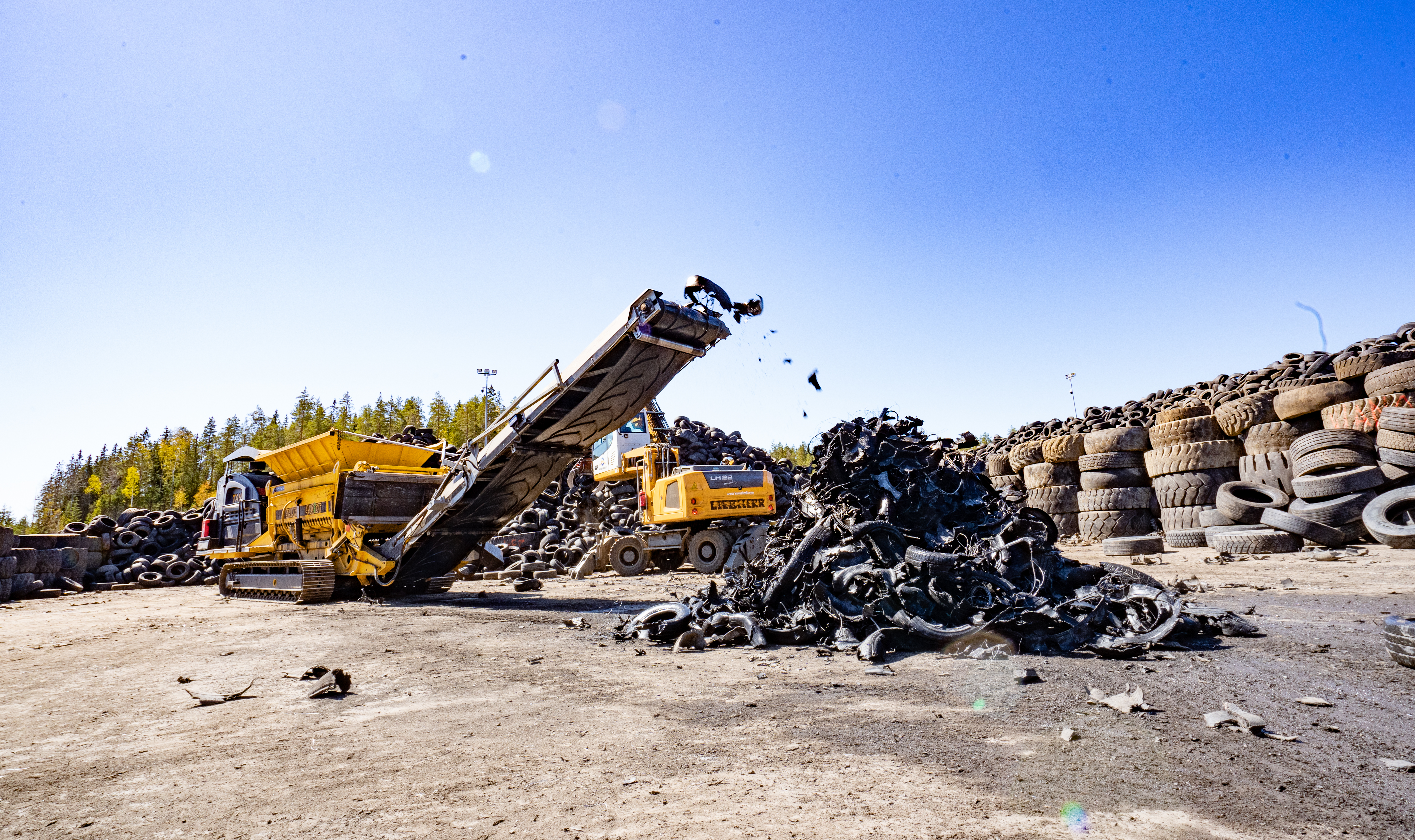 Kuusakosken Heinolan toimipisteessä näkyy renkaita silmänkantamattomiin. Renkaita paikan päällä TANA Shark-laitteella murskaa urakoitsija Peter Blomberg.