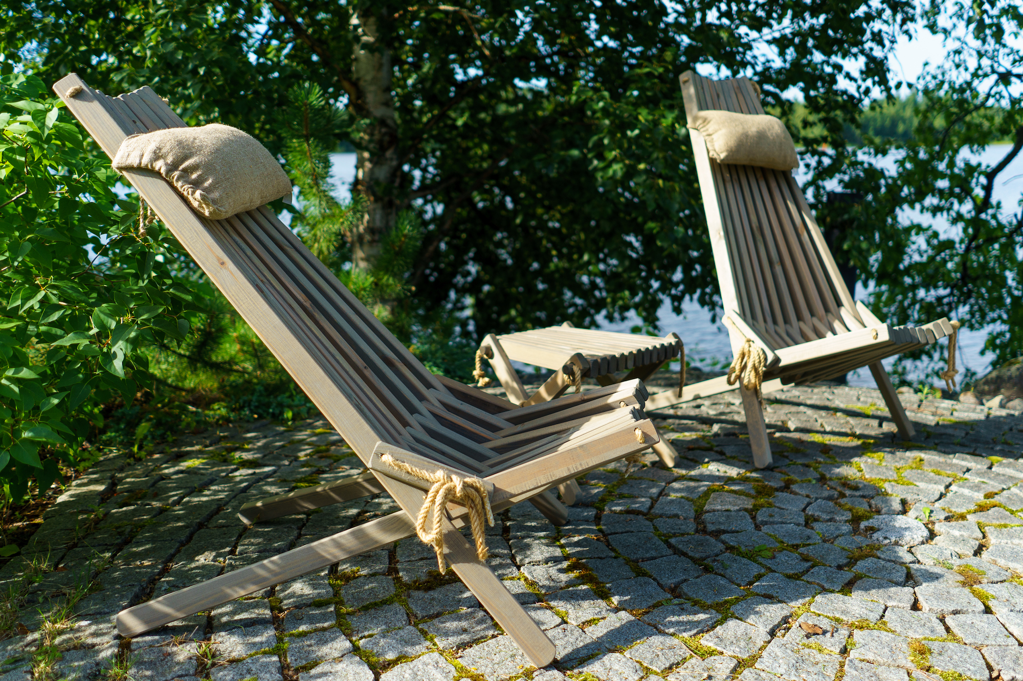 Kun tuolit tulivat, kokosivat Päivi ja hänen miehensä ne valmiiksi video-ohjeen avulla. Ekotuolit pitää kasassa hamppunaru, eikä tuoli sisällä narun ja puun lisäksi mitään muuta materiaalia. Päivillä ja hänen miehellään tuolit ovat käytössä rannalla nuotiopaikan istuimina.